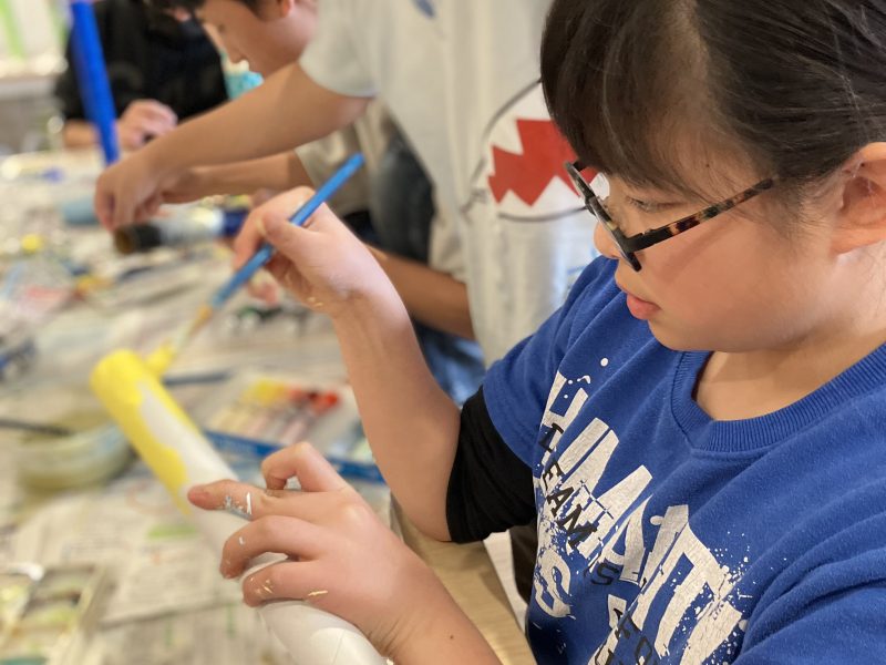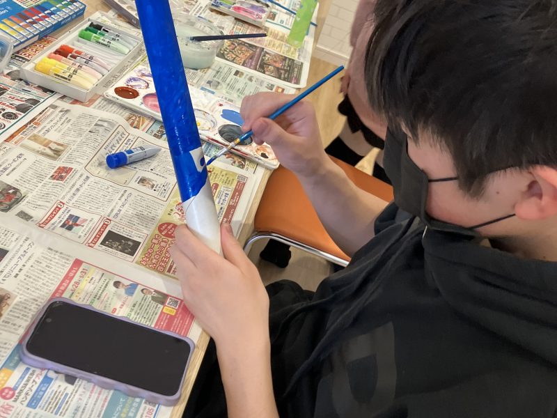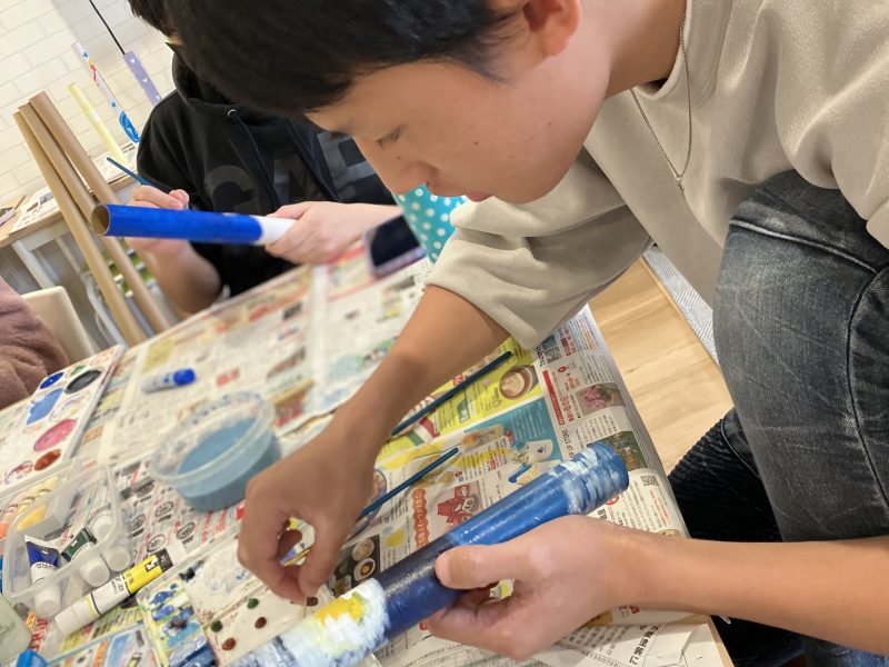 毎月第4土曜日ははちみつ食堂でこどもハローワークを開催します。今回は車椅子のブレーキ延長棒製作をしました。この棒は年に数回高齢者施設へ寄付をしに行きます。施設が明るくなったととても喜んでもらえます。子供達は喜んでもらえた時の笑顔を思い浮かべながら絵を描いています。絵が得意ではなくてもどうやったら喜んで貰えるかとても悩んで描いてます。