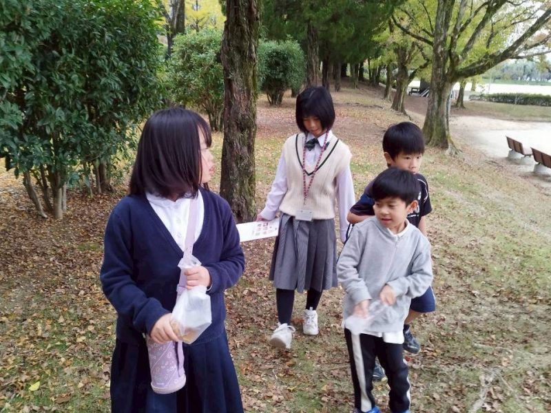 グループに分かれた子ども達はビンゴカードを手に、イチョウや紅葉、コオロギなどを見つけるぞ! と 気合十分♪