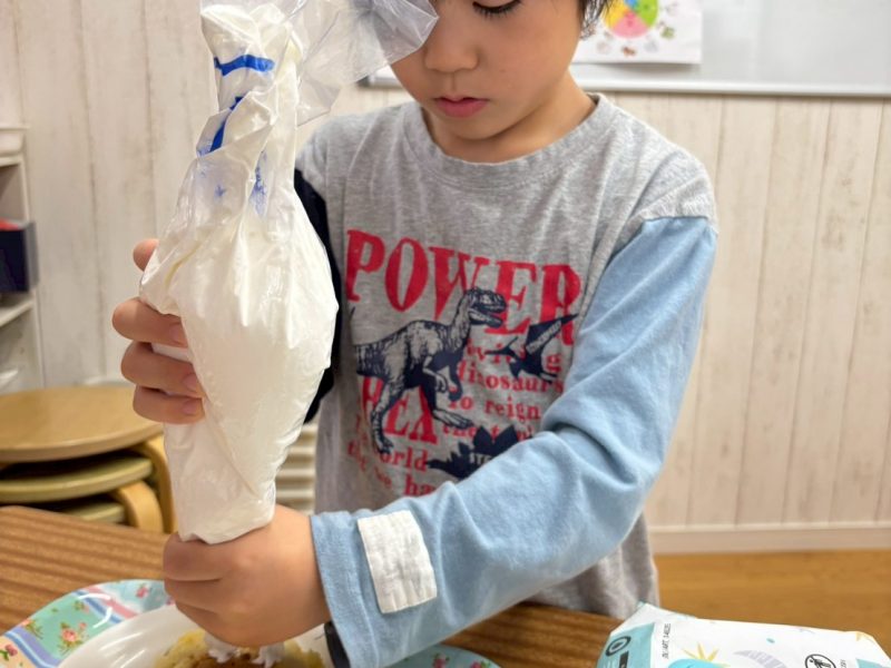 ホットケーキを子どもたちがそれぞれ生クリームやチョコスプレーを使ってデコレーションをし、オリジナルのケーキを作りました🥞