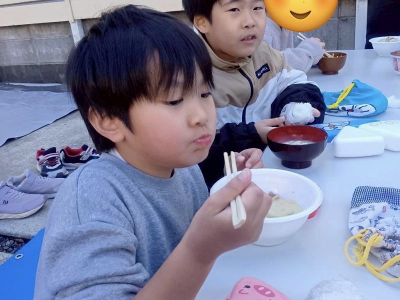 遅れて到着したお友達を皆で「頑張れ〜」と応援し、到着した後は美味しい特製豚汁を皆で食べ、心も身体も暖まりました🥰