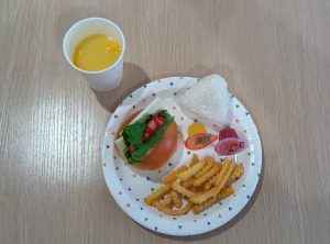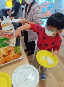 昼食は、ポテト、おにぎりなどと一緒にセルフでホットドッグを作って食べました🌭🍽️